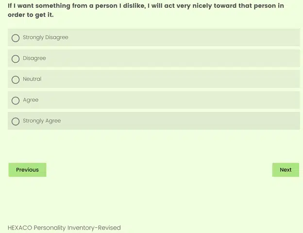 The HEXACO personality inventory has a 60-item and a 100-item questionnaire that examines personality traits in the six domains. Each topic is evaluated using a Likert scale with five possible responses, ranging from “Strongly Disagree” to “Strongly Agree.” The substantial evidence for the validity and reliability of the HEXACO personality test is supported by numerous research carried out over the world.