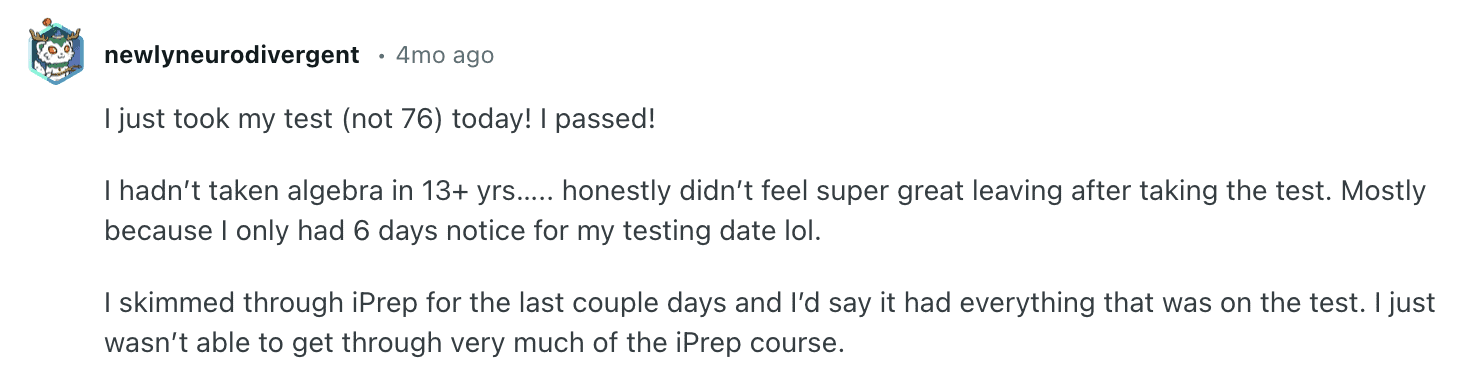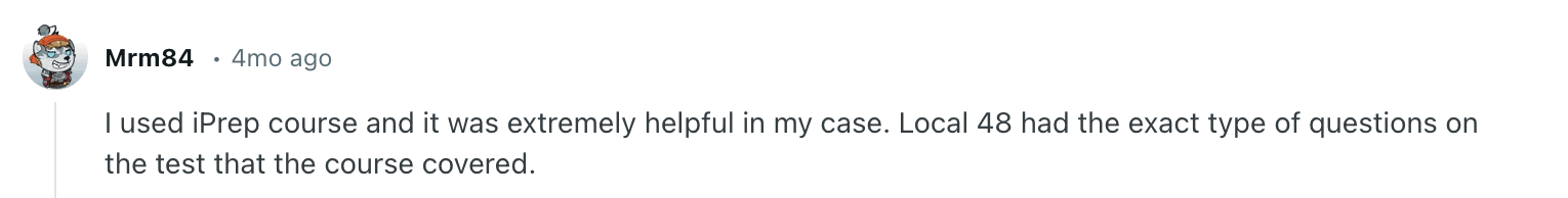 Without Iprep,I wouldnt have passed the IBEW aptitude test. Make time to study, put the work in and you will be fine. Thank You Iprep for the content and thorough explanations of problem solving.